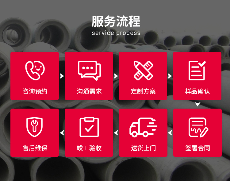 公司生產的各型水泥制品,經有關部門鑒定其質量和技術要求均符合國家標準。制造工藝先進,生產設備、設施規范,制造工序完善。產品具有抗滲、抗裂、防腐、堅固耐用等特點。